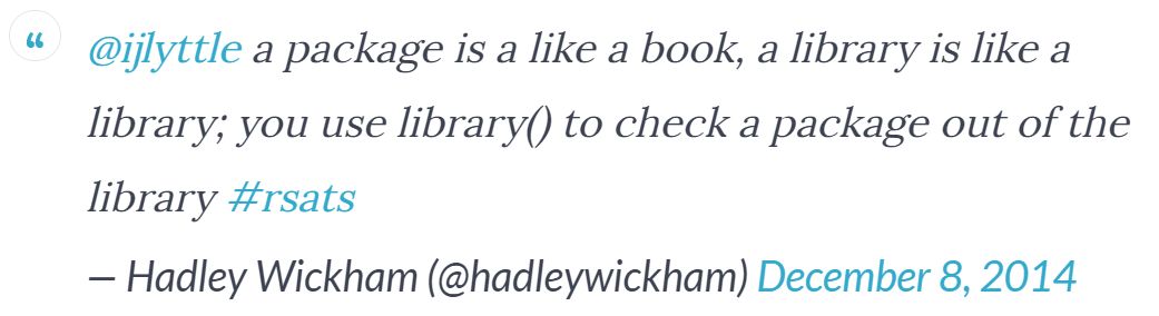 说到 library() 函数,有时候包和库之间会有混淆,有时候你可以返现人们会把库(libraries)也叫成包(packages)。