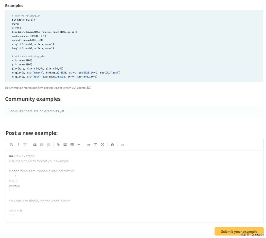 • 运行并提出示例。包中函数的帮助窗格将为您提供仅通过单击按钮就可以再次运行示例的选项。您还可以提出可以合并到帮助页面并由其他 R 用户测试的示例。